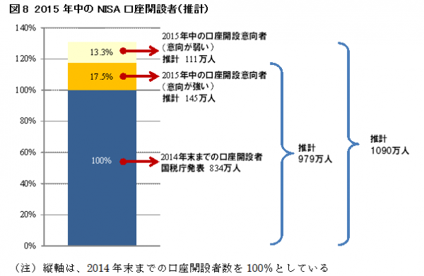 2015年中には、2014年末までの口座開設者数を100%としたとき、さらに17.5%の増加が見込まれ、979万人に達する見込みです。しかしこの数値は、NISA口座開設について強い意向を持つ人を取り出したものであり、意向はあるけれども、それほど強くは思っていない人も含めると同じく30.8%の増加となり、1,090万人に達する可能性もあります。
