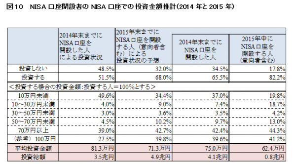 推計の元となった状況別の投資意向をみると、2014年に既にNISA口座で投資を開始した人については70.5%、2014年末までに口座を開設しながらも投資しなかった人で、2015年は投資する意向のある人は60.2%、また2015年に口座を開設する人で、実際に投資する意向のある人は82.2%となっています。
