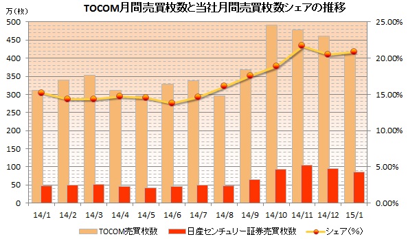 2015年1月の売買枚数は、865,145枚、同月の月間総売買枚数シェアが20.90%となり、3か月連続で20%を上回りました。