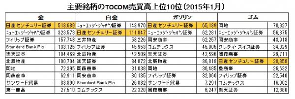 日産センチュリー証券(所在地:東京都中央区 代表取締役社長:二家英彰)の、東京商品取引所(以下、TOCOM)における2015年1月の取引実績を下記の通りお知らせいたします。