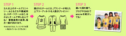 株式会社フェリシモ(神戸市中央区)のキッズスタイルブック『ano:ne(アノネ)』では、こども服の着心地などをSNSで広めていただけるシェアモニターを募集しています。このたび2015年2月12日(木)より、第5回の募集を開始いたします。友だち同士やスポーツチームなど、こども3人以上で写真を撮影し、専用ウェブサイトからエントリーしていただくと、その中から1チームをシェアモニターとして決定し、アノネで販売している服を、上下コーディネイトして人数分プレゼントいたします。シェアモニターの方にはプレゼントした服を着た写真を撮り、着こなしや楽しみ方についてレポートしていただくとともに、ご自身のブログやSNSなどでシェアしていただきます。