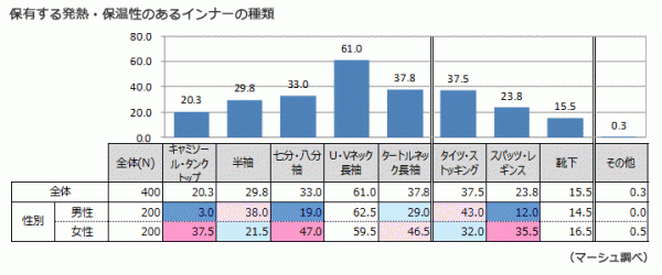 インターネット調査会社の株式会社マーシュ(東京都渋谷区渋谷、代表取締役:町田正一)は、全国在住の発熱・保温性のあるインナーのトップスを保有している20代~50代男女個人を対象に、機能性インナーに関する調査を実施しました。