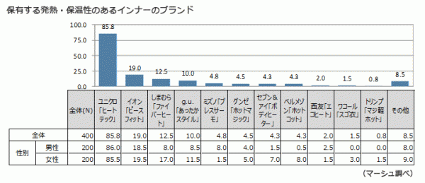 機能性インナーの火付け役とも言える、ユニクロの「ヒートテック」。数年前には、馴染みのなかった「機能性インナー」という言葉が、今では、夏は吸収性や、冷感素材等、冬は発熱・保温性等、季節に合ったインナーを着用することが、当たり前になってきた。そこで、今回は、発熱・保温性のあるインナー(トップス)保有者を対象に、保有状況や、保有前との違いを調査した。