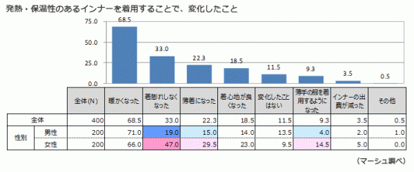 更に、発熱・保温性インナーの着用により、変化したことを尋ねると、男女共に「暖かくなった」が1番で全体の約7割を占めるが、「着膨れしなくなった」が男性は19.0%に対し、女性は47.0%、「薄着になった」が男性は15.0%に対し、女性は29.5%と、女性の方が大きな変化を感じている結果となった。