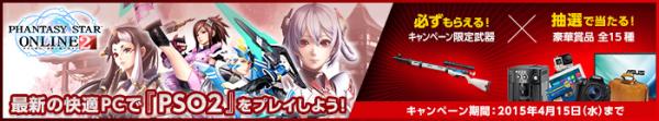 BTOパソコンを販売しているFRONTIERダイレクト(http://www.frontier-direct.jp/)では、2015年2月16日(月)より2015年4月15日までゲームパソコンの購入者全員に「ファンタシースターオンライン2(PSO2)」内で使える「M25SEミズーリ/リヒト (アサルトライフル)」のアイテムコードをもれなくプレゼントします。また、10万円分の旅行券やデジタルカメラなど豪華賞品が抽選で当たります。