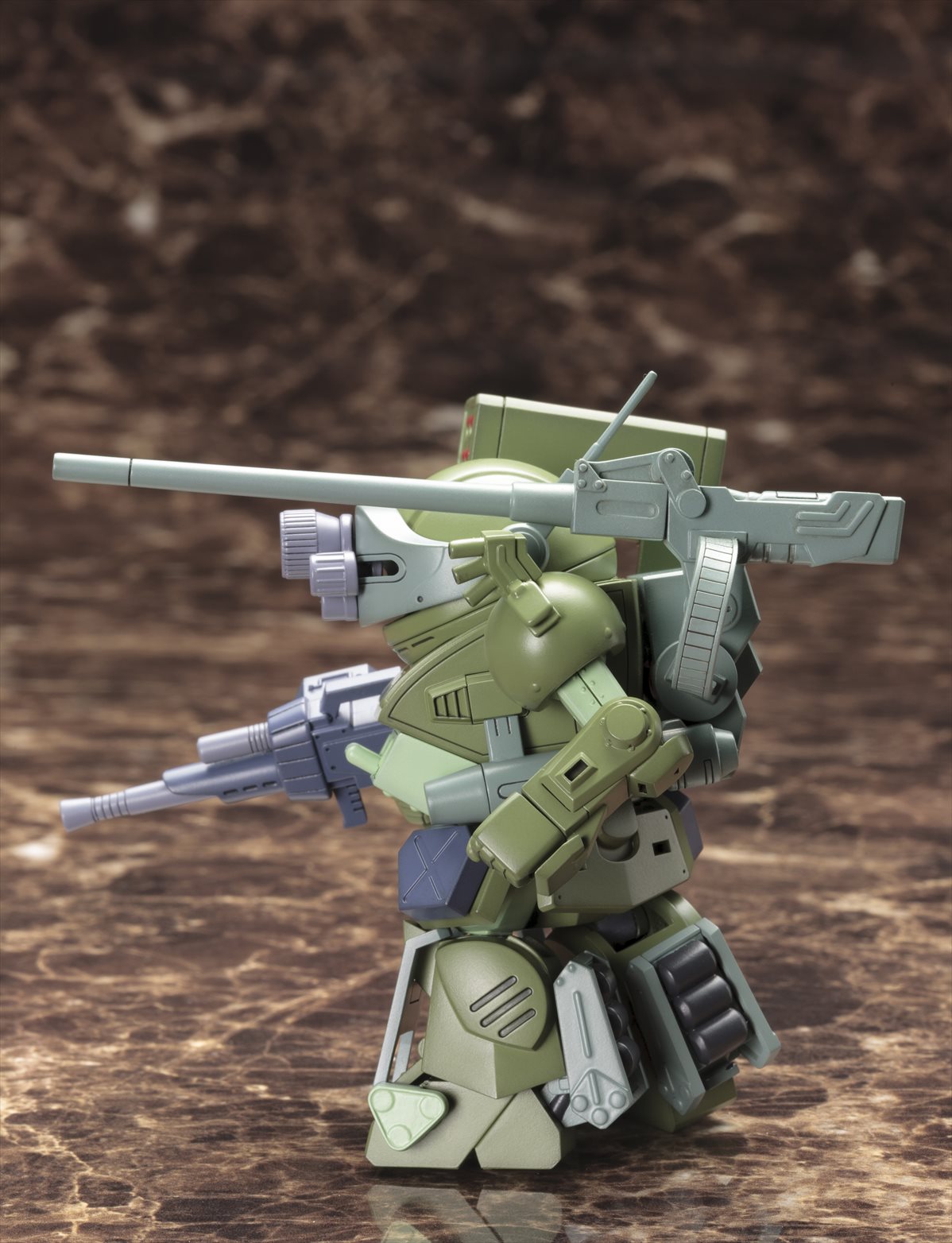 スコープドッグのバリエーション機となる本機は、荒地戦仕様の機体であり、悪路走行用のユニット「トランプルリガー」、「ドロッパーズフォールディングガン」を装備しています。脚部は降着状態を再現することができます。トランプルリガーの展開は、前側は差し替え無し、後ろ側のローラーは差し替え式になります。ドロッパーズフォールディングガンは差し替え無しで展開可能です。給弾ベルトは合成ゴム製にて成型し、フレキシブルに可動します。ドロッパーズフォールディングガンやミッションパックは、別売りの「D-スタイル スコープドッグ・ターボカスタム サンサ戦仕様 グレゴルー機&バイマン機&ムーザ機」などにも接続することができます。カメラアイのクリアグリーンとクリアオレンジは、塗装済みパーツにて再現しています。