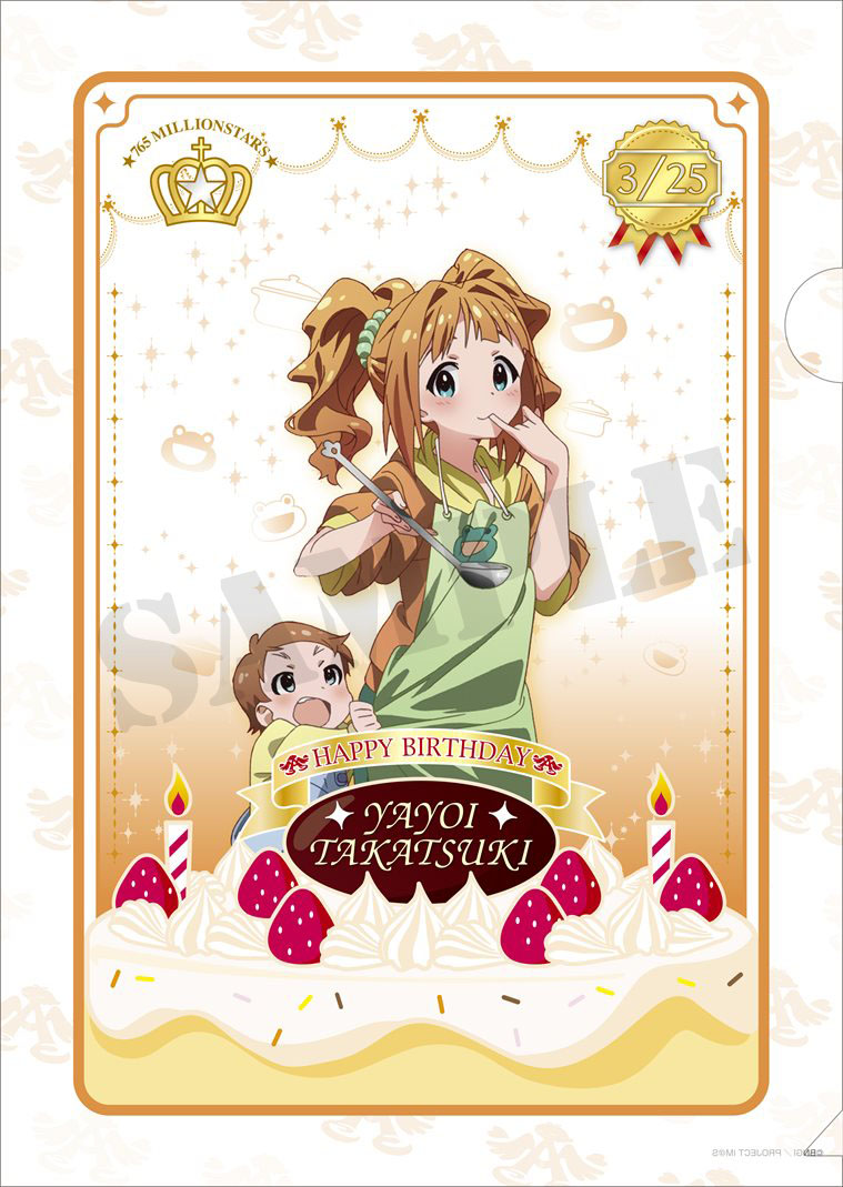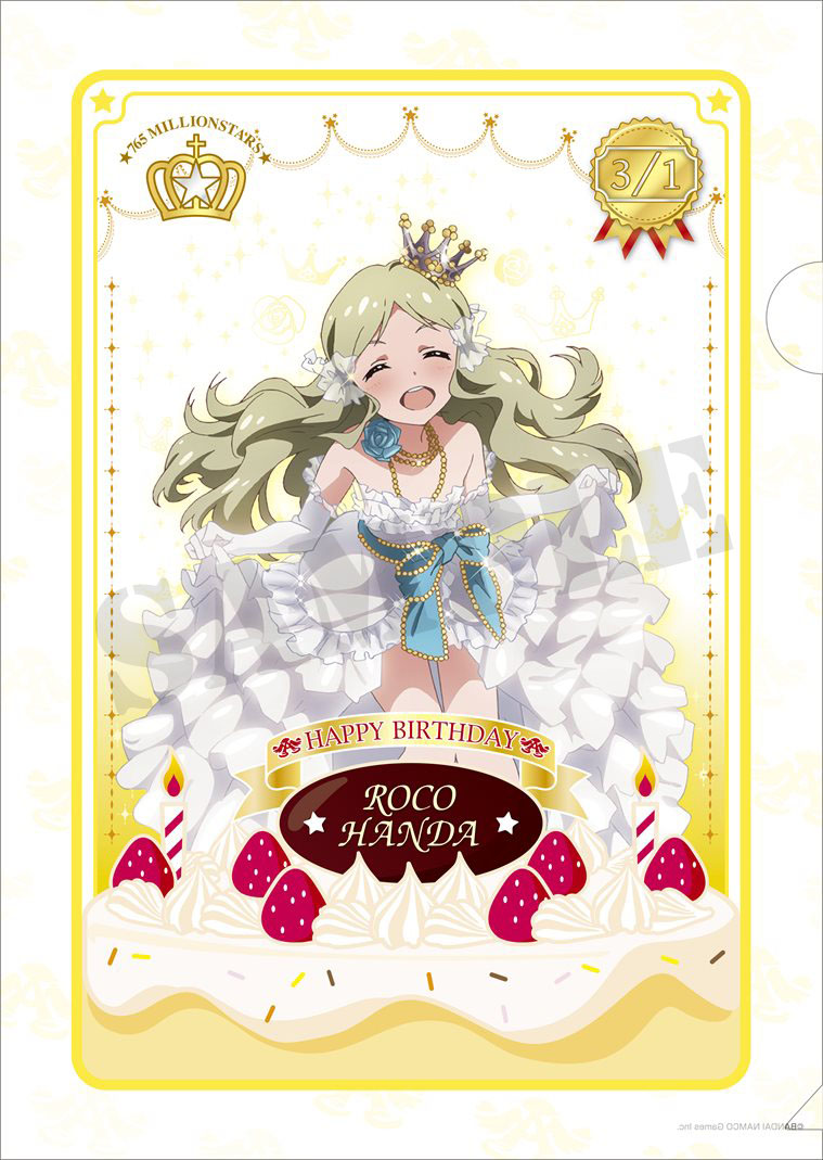 アイドル達のイラストはTVアニメ「THE IDOLM@STER」・劇場版「THE IDOLM@STER 輝きの向こう側へ!」制作のA-1 Picturesがゲームのために描き下ろしたものを使用。フレームにそれぞれのキャラクターのイメージカラーとバースデーケーキを加え、誕生日を迎えるアイドル達を豪華に、そして可愛くアレンジしたデザインのクリアファイルとなっています。第9弾として、3月が誕生日である「ロコ」「七尾百合子」「佐竹美奈子」「高槻やよい」「福田のり子」のクリアファイルを2015年3月1日より発売予定です。