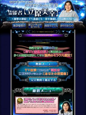 霊能者として多数メディアに露出し一世を風靡した『立原美幸』霊能者としてフジテレビ「奇跡体験!アンビリバボー」に出演した際は多くの人々の悩みを根本解決してきた。その他にも、雑誌「anan」に記事が掲載されるなど立原の人気は未だに絶大! 現在は、占いイベントへの出演や地方で直接鑑定を行うなど幅広く活躍している。飾らず優しい口調で、かつ相談者のためを思って時々辛口コメントになることもあるがズバリ言い当てる! その鑑定は、相談者の悩みを解決するだけでなく前に進む勇気と覚悟をも与えてくれるという。