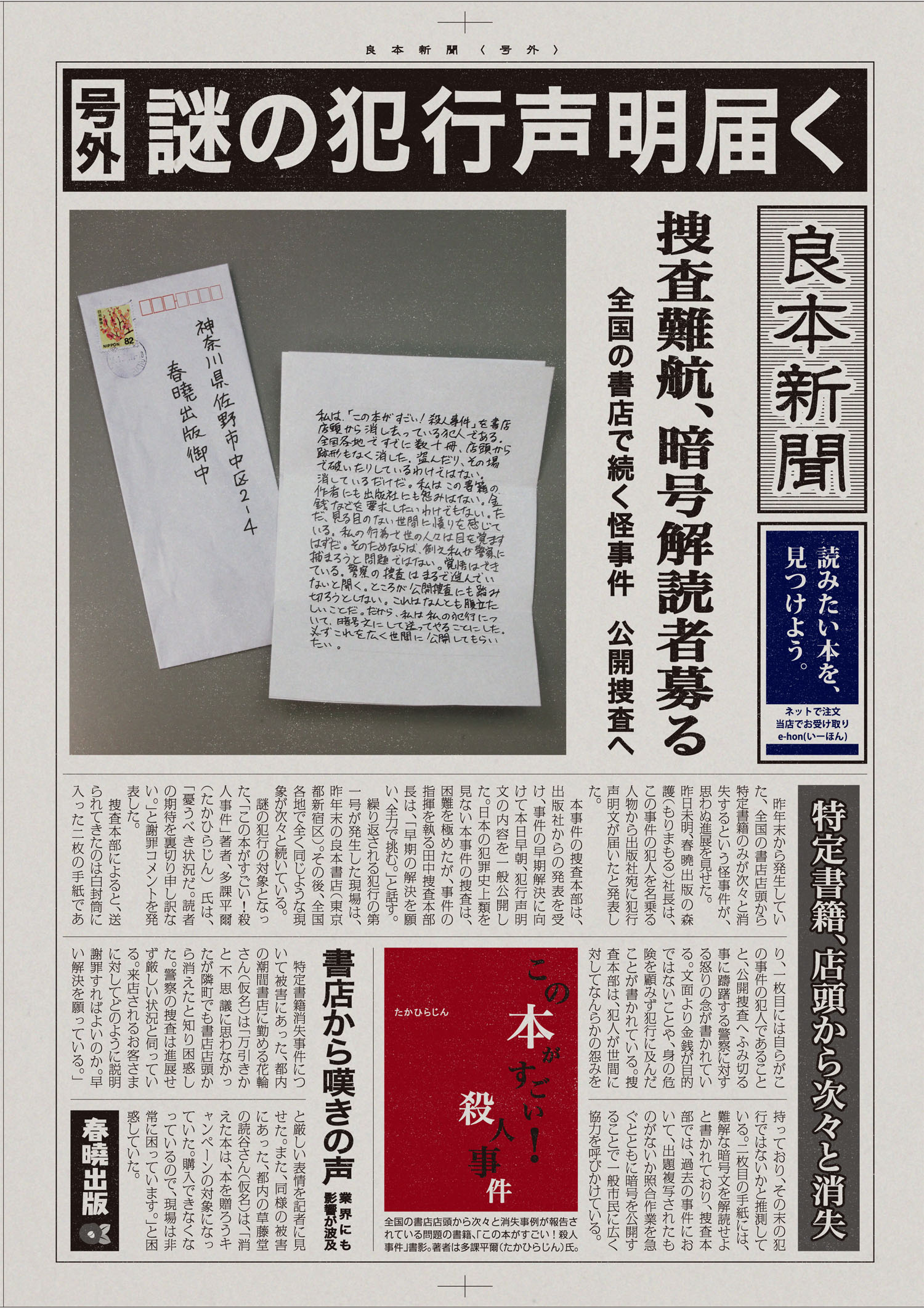 「e-honミステリーキャンペーン」は、とある書籍が書店店頭から消失し、犯人の出した犯行声明からその謎を解明していくという仮想ストーリーを楽しむことで集客を高める企画です。キャンペーン参加希望者はまず書店店頭で新聞号外に見立てたキャンペーンチラシ(問題用紙)を入手し、真相を解明しなければなりません。謎解きに興味のある多くの人に書店店頭に足を運んでいただくことを最大の目的とします。参加者が挑戦する謎は計6問とし、全問正解者には「名探偵賞」を、3問正解で「探偵賞」をそれぞれ抽選で贈呈します。まずは書店店頭でキャンペーンチラシを入手ください。