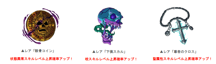 これらは経験値がアップするだけでなく、一部のスキルレベル上昇確率もアップします。