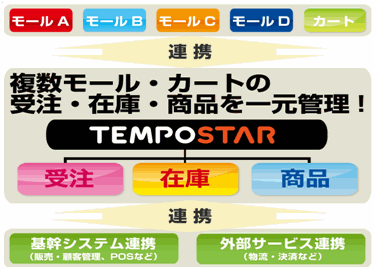 「TEMPOSTAR」は、株式会社SAVAWAY(※1)が10年間にわたって蓄積してきた多店舗ネットショップ管理のノウハウを引き継ぎ、複数のショッピングモールに出店しているネットショップを一括に管理することが可能な多店舗管理ツールであり、各モールで用意されたシステムを全く意識することなく、一画面ですべての受注情報を処理、商品情報や在庫情報も一元的に管理することができるクラウド環境のプラットフォームです。