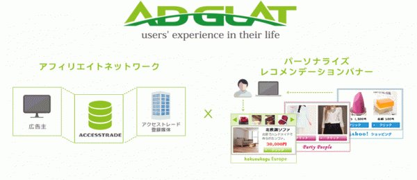 「ADGLAT」は、当社とサイジニア株式会社(所在地:東京都品川区、代表取締役社長:吉井伸一郎、証券コード:6031)が共同開発し2014年6月より提供を開始している、ユーザーの行動履歴を収集・解析し、ユーザーの属性、嗜好に基づいた広告配信の最適化を支援するサービスです。広告主サイトに来訪したユーザーの購買データや閲覧データなどWebサイト上の行動履歴データを解析し、『アクセストレード』が保有するアフィリエイトパートナーのWebサイト枠へ配信いたします。ユーザーの興味嗜好に沿ったアイテムや画像、バナー広告を、レコメンド広告としてリアルタイムに提供することで、広告主がより高い成果を得ることを可能にした広告配信サービスです。