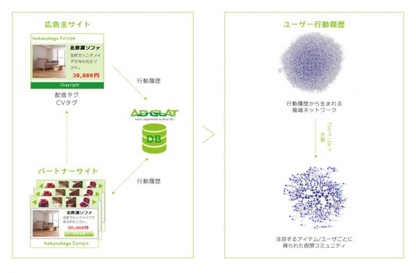 ・広告主のサイトを訪問したユーザーの行動履歴を分析し、複雑ネットワーク理論をベースにしたレコメンデーションエンジン「デクワス」で推奨された商品をリアルタイムに配信