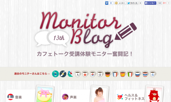 精鋭15名のモニターが、独自の観点で注目のレッスンと講師をブログでレポート。カフェトークでのお気に入りレッスンや講師発掘に、お役立てください!