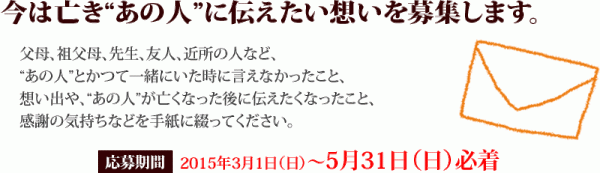 「今は亡きあの人へ伝えたい言葉」実行委員会は、今年6回目となる「今は亡きあの人へ伝えたい言葉」のお手紙を2015年3月1日から5月31日までの3ヶ月間、募集いたします。
