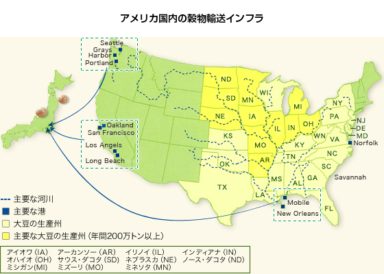 アメリカのNon-GMO (遺伝子組み換えでない)は、広大な土地で栽培されているため、一部に天候などによる被害が出ても他の地域で補えるというリスク分散にも優れています。 世界一の大豆生産と最新鋭の穀物輸送インフラをもつアメリカだから実現できる安定供給なのです。