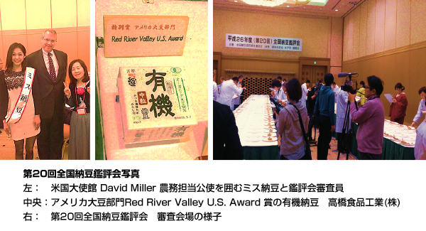 第20回全国納豆鑑評会にてアメリカ大豆を使用した美味しい納豆を表彰するアメリカ大豆部門 Red River Valley U.S. Award賞 受賞作品は 有機納豆 高橋食品工業(株) / Organic Natto Takahashi Shokuhin Kougyouに決定しました。 入賞した商品は、5年間にわたりパッケージに受賞した賞を明記する栄誉が与えられます。