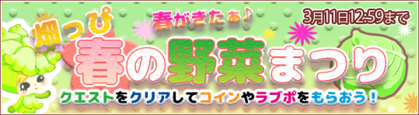 株式会社エルディは、株式会社サクセス(本社:東京都品川区、代表取締役:吉成 隆杜)と協業で開発・運営している携帯アプリゲーム『畑っぴ~里山くらし~』にて、期間限定イベント、「畑っぴ春の野菜まつり」を開始、同時にイベント野菜として「春キャベツ」を追加いたしましたことをお知らせいたします。