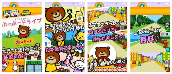 『ぶーぶードライブ』は、可愛らしい動物キャラクターが登場する絵本の世界で、子供たちに大好きな「くるま」を運転してもらい、ドライブを楽しみながら感性や数の認識をはぐくめるインタラクティブな知育アプリです。端末を傾けるだけの簡単操作で、うまく運転できなくても自動でゴールまで誘導されるので、小さいお子様でも楽しんで遊ぶことができます。