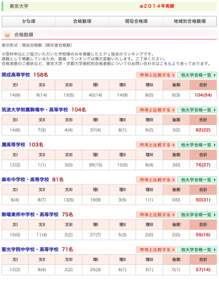 コンテンツ内では、毎年200校もの進学校が大学ごとの合格者数を学部・現役/既卒ごとに掲載し、各大学毎の高校ランキングや、高校別の合格者数ページなど抜群です。昨年2014年度版ではニュースメディアにも取り上げられ、全ページで1ヶ月630万回の閲覧がありました。