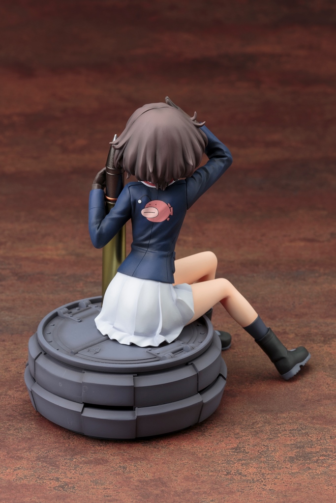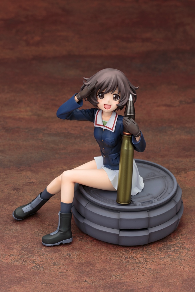 「IV号戦車D型改(F2型仕様)」のキューポラに座り、元気いっぱいな笑顔の表情で立体化、ユニークなシルエットのふわふわとした髪も丁寧に造形しました。また、キュープラや脇に抱えた砲弾など、無機物特有の色味にもこだわって再現しています。