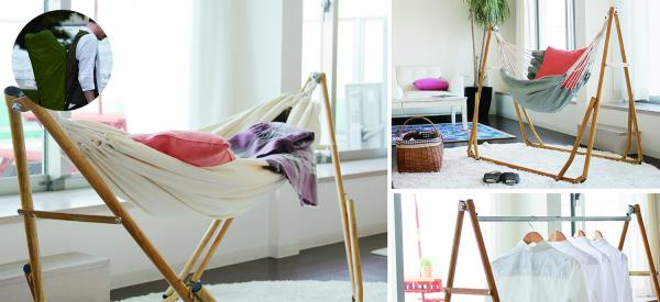 SFF-04 3WAY 自立式ポータブルハンモック&チェアー+One C-2 -WOOD- =写真= を2015年4月11日から発売いたします。ハンモックとチェアー、そしてハンガーラックの3WAYハンモックで贅沢な毎日をお届けいたします。お部屋によく馴染む美しい木目調のスタンドがポイントのハンモックセットはアウトドアはもちろんインテリアとしても十分楽しめます。スタンドの組立てが簡単に行なえるので、用途に合わせて様々なシーンでお使いいただけます。