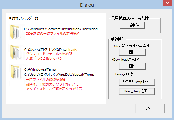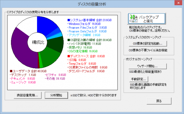 知らない間にゴミ屋敷とかしているTempフォルダ、ダウンロードフォルダをウィザードにより説明しディスクの整理をアシストします。SSDの導入前のC:ドライブに大掃除に利用ください。SSD導入後でも定期的なディスクの掃除に効果を発揮します。