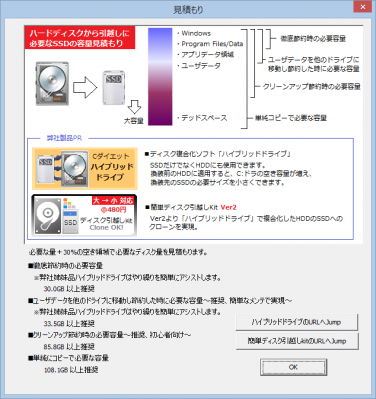 SSDはハードディスクより容量が少ないのが普通です。使い込んだハードディスクをSSDに移行しようとする時、どうしても大容量のSSDが必要となり出費がかさみます。本ソフトは事前にディスク装置の内部の使用状況を調査し必要最小限のSSD容量を計算します。
