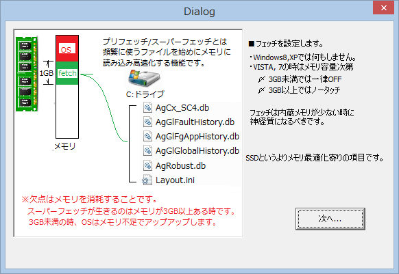 Windowsにはプリフェッチ、スーパーフェッチという機能があります。これは良く使うファイルをメモリに先読みしておき高速化しようという機能です。この機能はSSDは高速のため不要といわれています。これに対して自動設定します。