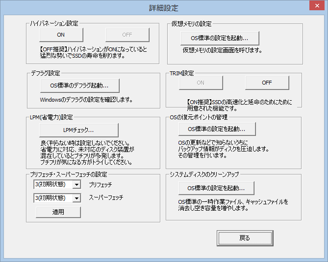 「SSD最適化設定」はこれらの設定をワンタッチでチェックし説明しアシストします。
