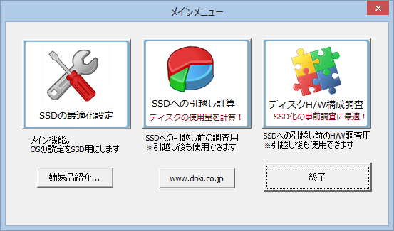 本ソフトは初心者用が簡単にSSDを導入できるようアシストし、そしてSSDを導入した後はWinodwsの設定をSSDに適した設定にするソフトです。これからSSDの導入を検討している個人ユーザ、導入済み個人ユーザを対象に無料配布します。