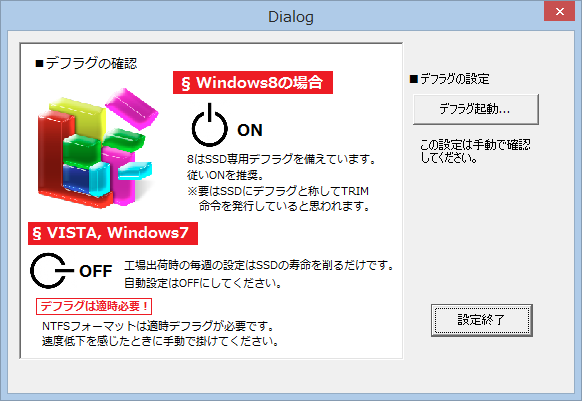 現在のWindowsはこのデフラグが標準で毎週自動実行するようになっています。この設定を初心者に判り易いようにガイドし設定をアシストします。デフラグのは煩雑な事にWindows8ではONが推奨であり、それ以前のOSではOFFが推奨です。