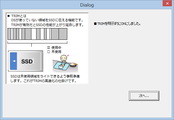 Windows7からSSD専用機能としてTRIMという機能を装備しました。TRIMは通常はONですがハードディスクから換装した時などこれがOFFになっている可能性が想定できます。「SSD最適化設定」はこの設定を明示的にONにします。