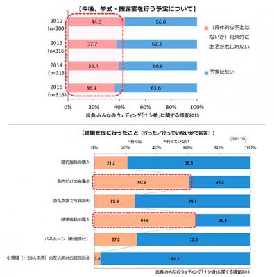 結婚式場選びの口コミサイトを運営する株式会社みんなのウェディング(本社:東京都中央区、代表取締役:内田陽介)は、2012年から行っている、入籍はしたが結婚式はしない、いわゆる「ナシ婚」層の2015年の傾向把握を目的としたアンケート調査結果を公開いたします。