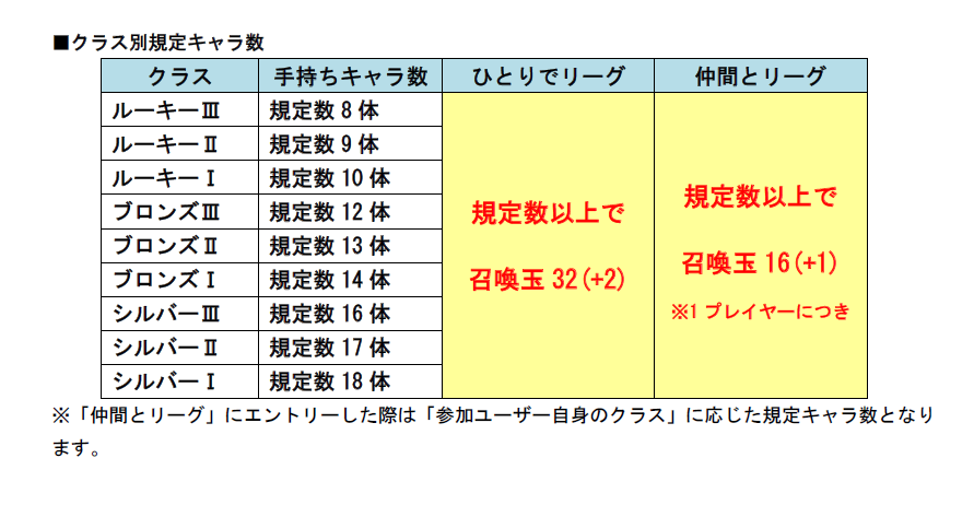 リーグの所属クラスに応じた手持ちのキャラ数によって、リーグ戦バトル時の