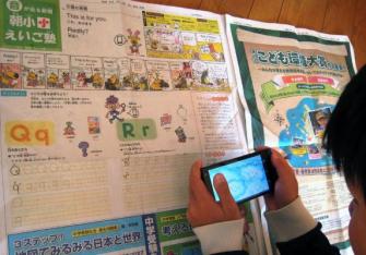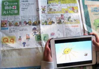 『朝小えいご塾』は、新聞紙上のキャラクターにスマートフォンをかざすと、英語の映像や音声が流れるしくみを利用した英語学習コーナー。 新聞紙面を用いて、言語学習には不可欠な音声インプットを可能にした、“音が出る新聞”として注目されています。