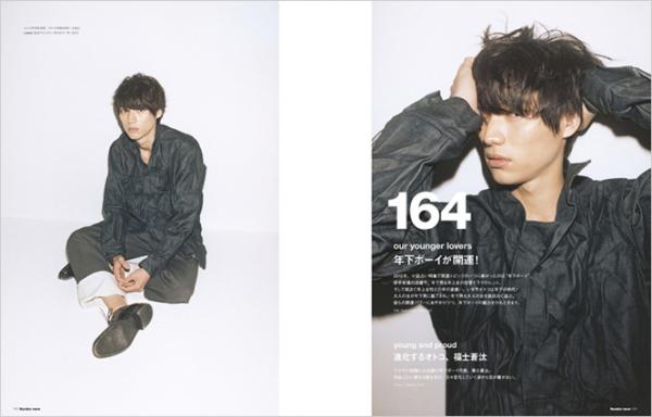 特集内で年下ボーイ代表として登場するのが、現在21歳の福士蒼汰。昨年大ヒットしたドラマ『きょうは会社休みます。』で、30女が恋に落ちる大学生役で年下男ブームをけん引してきた彼だが、3月14日公開の映画『ストロボ・エッジ』で演じる一ノ瀬蓮という役柄も、年上女性と付き合っているという設定。自身も2人の姉をもち、年上の女性との恋愛は「もちろん、アリです」。好きな人には自分で告白するタイプだそうで、「相手が年上でも自分からいうと思います」と、“年上女”をドキリとさせる発言も。そのほか、彼の恋愛観や年上女性の魅力など、等身大の“オトコゴコロ”について語ってくれた。男らしさとあどけなさが同居したような、撮りおろしのビジュアルも必見。