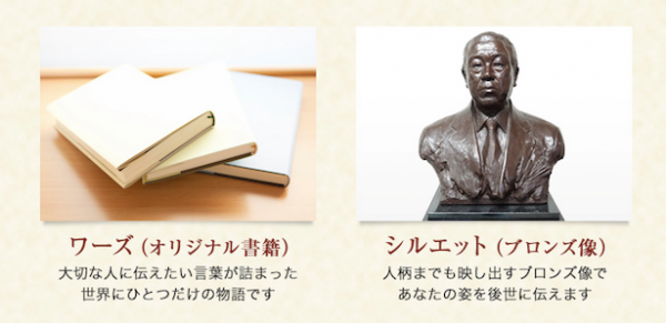 従来の「自分史」作成などのサービスでは、ご本人またはライターが本文を書き、それを書籍として販売する、という形が一般的でした。今回の「ワーズアンドシルエット」では、オリジナル書籍を作成するとともに、それを置くスペースにもこだわりました。具体的には、その人の姿を33センチの高さの銅像として作るととともに、専用のブックスタンドを作成。まるで目の前の人から、直接本を手渡されたような感動を提供します。