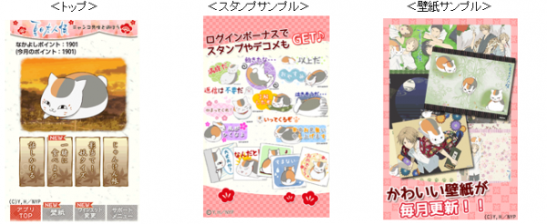 これまで『夏目友人帳 ニャンコ先生と遊ぼう』をKDDIの「auスマートパス」で配信し、キャラクターカテゴリーで上位に ランキングされる人気をいただいてまいりましたが、今般の「App Pass」での提供開始により、一層多くの「夏目友人帳」ファンに お楽しみいただけますことを期待しています。 『夏目友人帳 ニャンコ先生と遊ぼう』の詳細は、添付資料をご覧ください。