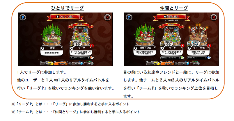他のユーザーと1 人vs1 人のリアルタイムバトルを行い「リーグP」を稼いでランキングを競い合います。