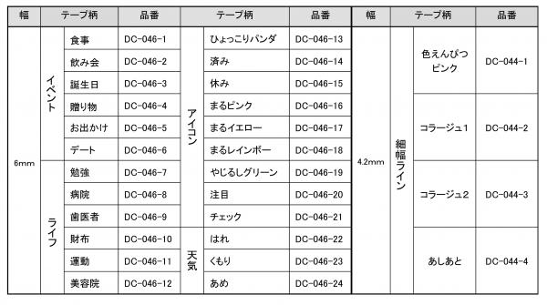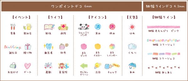 テープだからこそできる、色えんぴつで描いたようなやさしい雰囲気に仕上げました。全28柄は、スケジュール管理や日記、記録に便利で実用的なデザイン。誕生日や飲み会など、大切な日をマークする「イベント」6柄。病院や美容院など、生活に欠かせない予定をしっかり管理できる「ライフ」6柄。大切な情報の目印やタスク管理など幅広いシーンで使える「アイコン」9柄。はれ・くもり・あめの「天気」3柄。そして、情報を見やすく縁取りできるテープ幅4.2mmの「細幅ライン」4柄です。