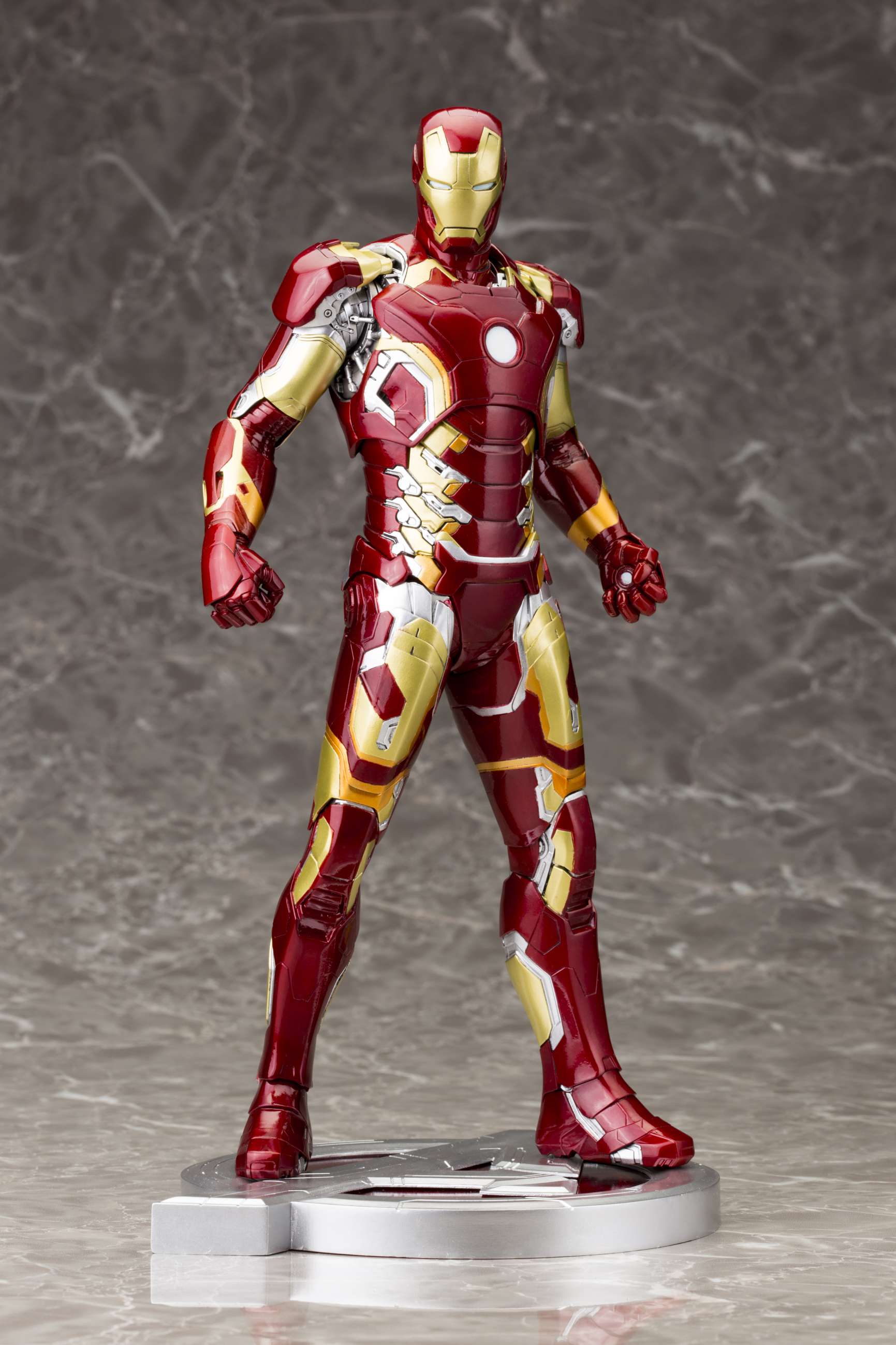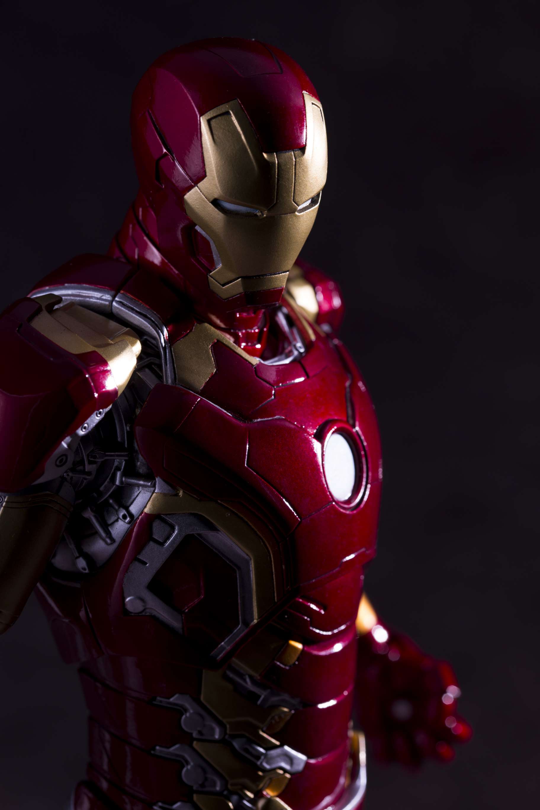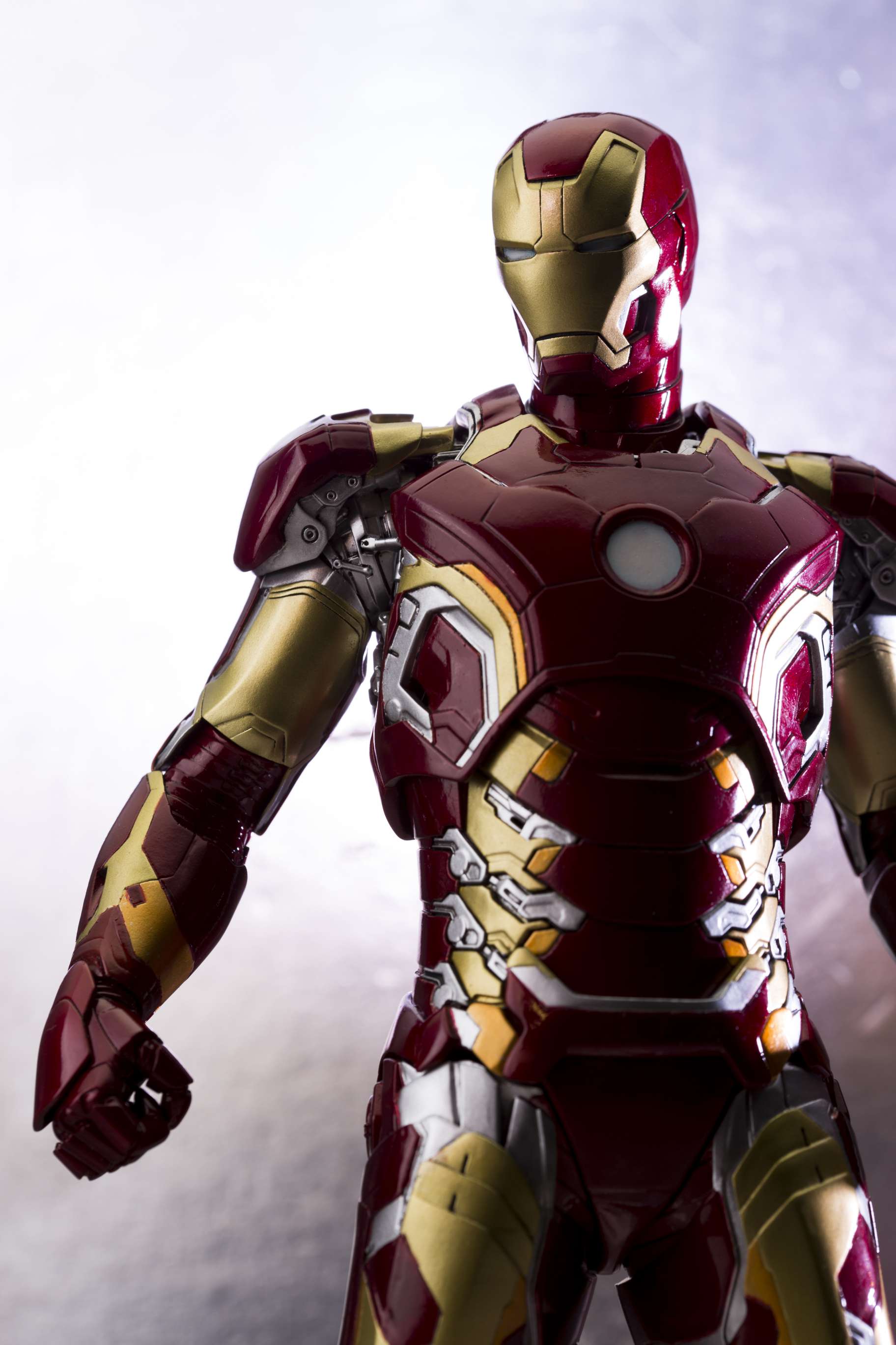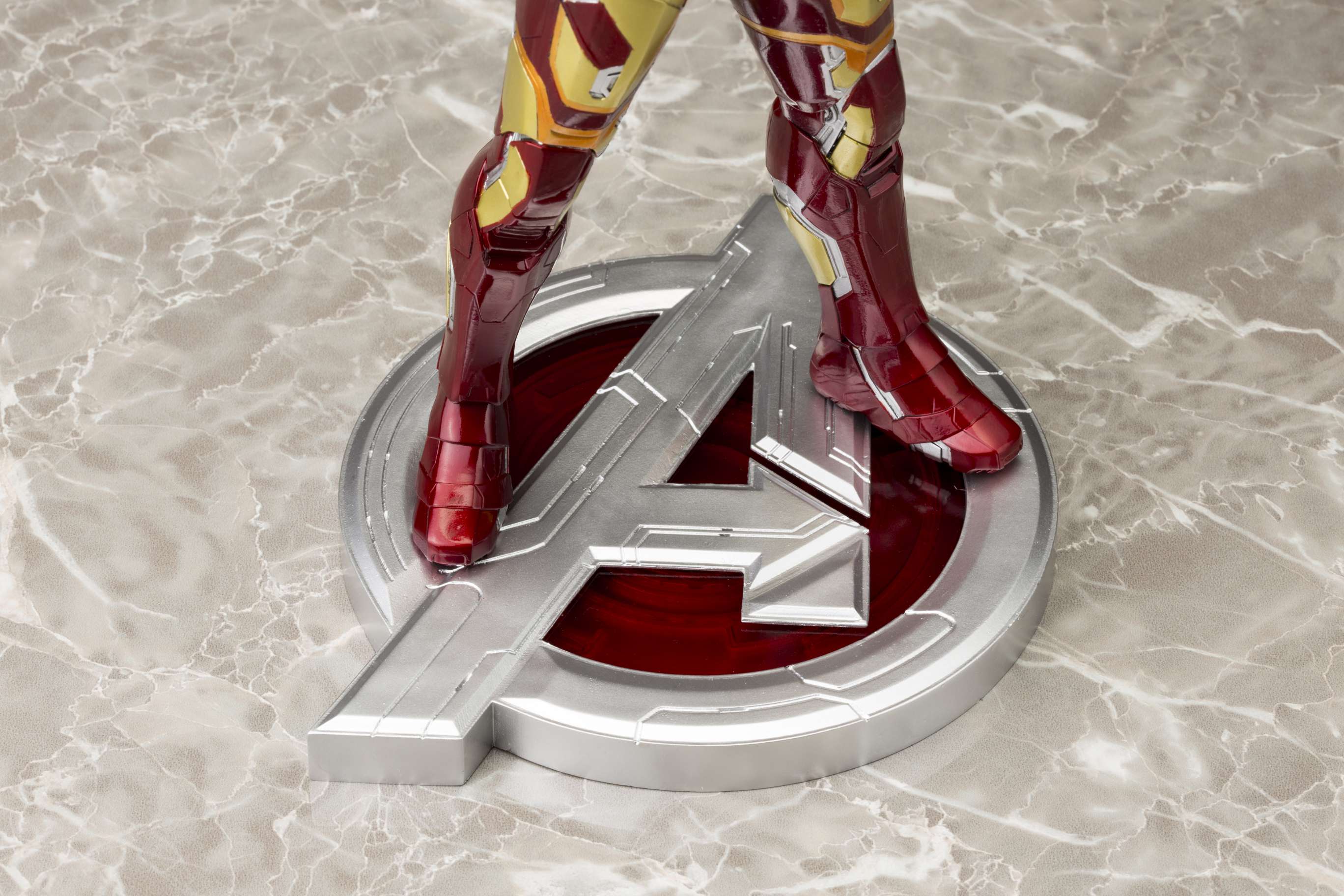 全高約30cmの商品サイズで、ポージングはミュージアムスタイルの立ち姿で立体化しました。今回のスーツは『アイアンマン3』時に着用したMARK42から更にアップデートされた最新版で、アイアンマンらしいレッドを基調としたカラーリングが復活。両眼に加えて胸のアークリアクター、左右の掌底部がLEDでライトアップするギミックを搭載。台座は、お馴染みのアベンジャーズマークと本作のヴィランとして登場する強敵ウルトロンを象徴するクリアレッドのパーツとメカニカルな意匠を組み合わせた、メモリアルベースとなっています。