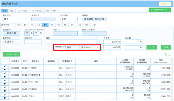 【画像】「ネットde会計(R)」15.3.0 出納帳画面(部分)