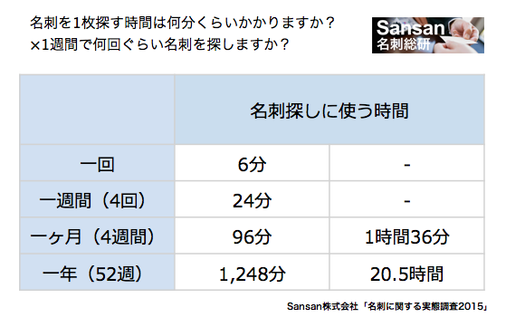 名刺は一人平均「週に4回」、「一回につき6分」を使って探していることがわかった。つまり、一週間では「24分」、一ヶ月(4週間)で「1時間36分」、一年では「20.5時間」が名刺探しに費やされている。