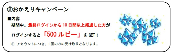 期間中、最終ログインから10日間以上経過した方がログインすると「500ルビー」をGET!