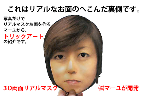 このトリックアートリアルマスクお面は、一般の3D製作では難しい両面に顔写真を配置して