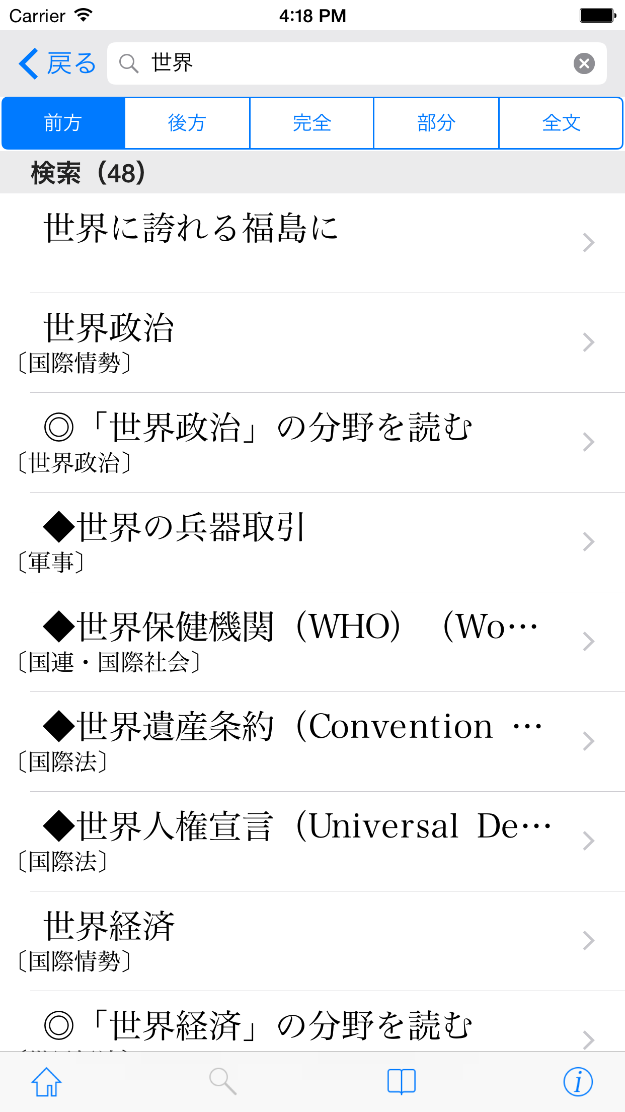 ●豊富な検索オプションを用意(前方一致 / 後方一致 / 完全一致 / 部分一致 / 全文検索)。それぞれの検索方法で、文字を入力すると候補見出し語が表示されるインクリメンタルサーチに対応。(部分一致・全文検索を除く)用語をうろ覚えでも検索が容易です。