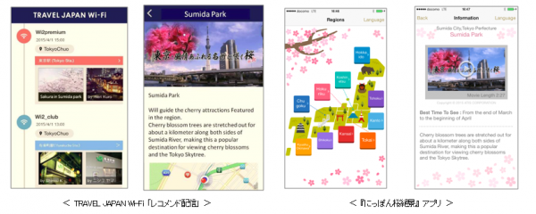 今般のコラボ企画では、観光客が『Travel Japan Wi-Fi』を使用してネットワークに接続すると、近隣のお勧めスポットを紹介する「レコメンド配信」内に桜の名所情報が地図とともに表示され、観光客は任意で『にっぽん桜絶景』アプリをダウンロード して桜観賞をお楽しみいただけます。