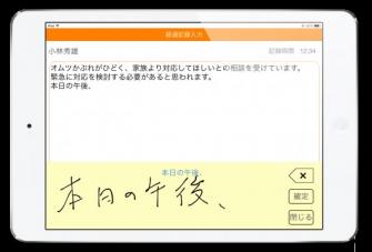 紙に書く感覚でiPadにケア記録を手書き入力します。手書き入力した文字が数字、かな、漢字、記号に自動で活字変換されるため、初めてiPadをお使いになる介護職員の方でも直感的に利用できます。