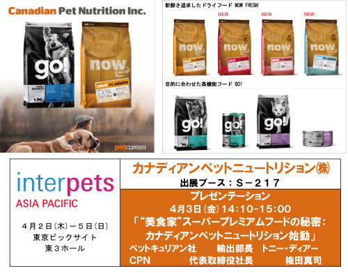 また、4月3日(金)14時10分からの出展者プレゼンテーションにおいて、ペットキュリアン社のトニー・ディアー氏と当社代表・権田真司が、「ナウ フレッシュ」「ゴー!」の新商品発表とそれらの魅力についてご紹介いたします。